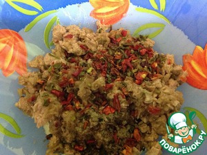 Жгучий перец освобождаем от семян и мелко режем, добавляем в начинку и перемешиваем.