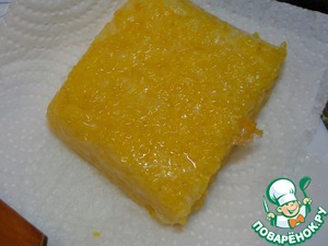 Готовую поленту выложить на слой пищевой плёнки, накрыть вторым слоем и хорошо разровнять руками в пласт толщиной около 1,5 см. Дать полностью остыть.