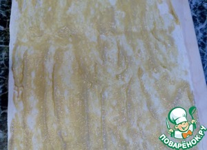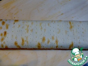 Из лаваша вырезать прямоугольник и смазать его горчицей.