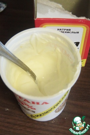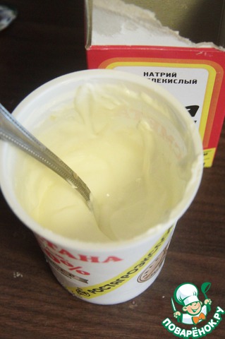 В сметану добавьте соду и перемешайте. Имейте ввиду, что сметана увеличится в объеме.