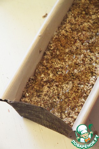 В форму для кекса выкладывайте часть теста, на нее орехи, поливайте их медом и закрывайте оставшимся тестом.