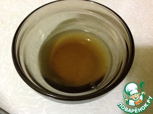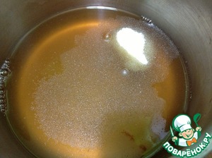 Через 40 мин. бульон ставим на плиту греть примерно до 60 градусов, не кипятим. Бульон постоянно помешиваем. В посуду, где будем делать заливное, наливаем бульон на треть. Ставим на подоконник остывать до полного застывания