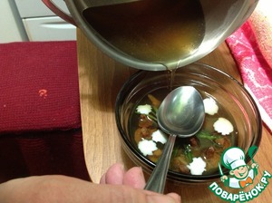Даем остыть грибному отцеженному бульону, когда он станет теплым, добавляем желатин, помешали и оставляем на 40 мин, чтобы желатин распустился
