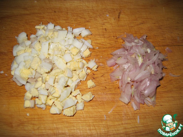 Хек отварить в чуть подсоленной воде до готовности, остудить и отделить филе от костей.