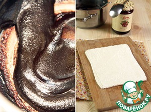 Теперь приступим к формированию булочек. Тесто покроем ровным слоем черемуховой начинки, а по двум сторонам выложим Соус D’arbo Дикая брусника. После этого скатаем "брусничные" края к центру.