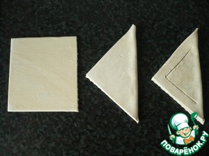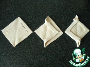 Тесто нарезать квадратиками, сложить его вдвое, чтобы получился треугольник. В треугольнике отступить 1 см. от края и сделать ножом надрезы с обеих сторон.