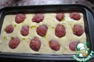 Форму для выпечки смазываем маслом, выкладываем половину теста и половину фрикаделек. Затем выливаем оставшееся тесто и сверху втыкаем оставшиеся фрикадельки. Слегка сбрызгиваем поверхность оливковым маслом.