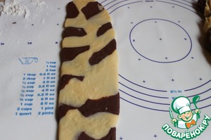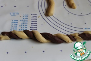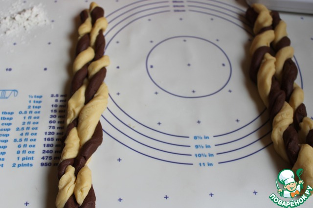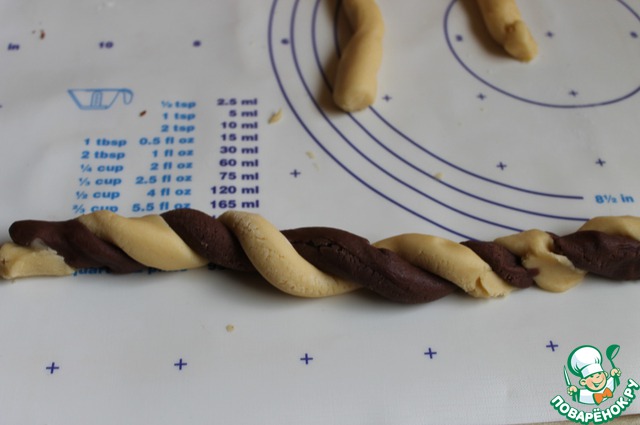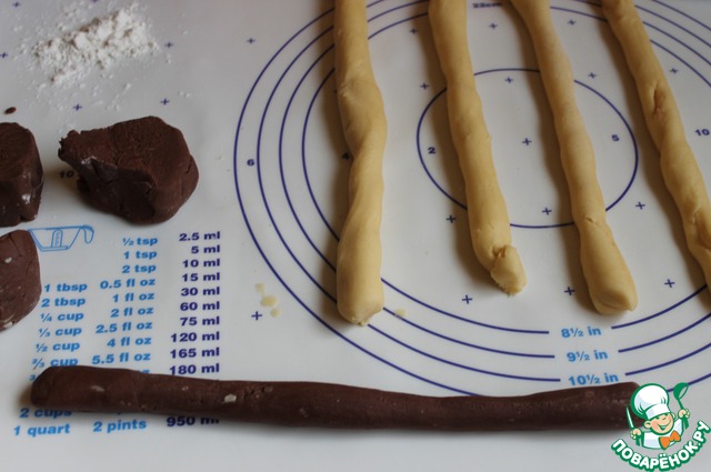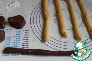 Теперь каждое тесто разделим на 4 части. И скатаем такие жгутики.