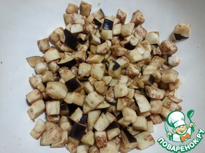 Баклажаны нарезать довольно мелкими кубиками, хорошенько посолить и оставить на 30 минут, чтобы пустили сок. После истечения времени, промыть их в холодной воде, отжать или пересыпать в дуршлаг, чтобы стекла вода.