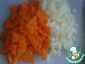 Нарезаем морковь полукружочками, лук - достаточно крупными кубиками. Отправляем в кастрюлю. Провариваем около 10 мин.