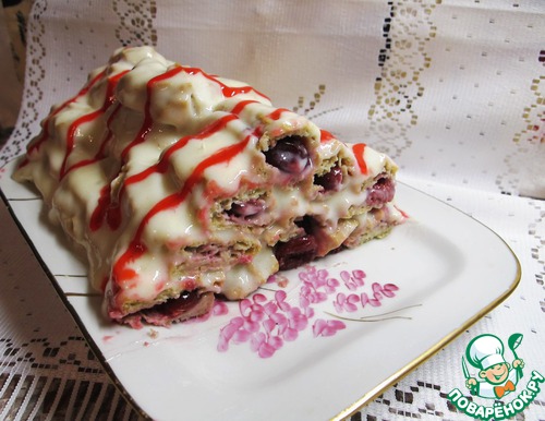Вместо просто размороженной вишни, я ее сварила в апельсиновом соке с апельсиновой цедрой и парой ложек сахара... Сметаны не было - сделала белый крем из манной каши и масла... Выложила один слой печенок- вишня- слой печенок и крем..