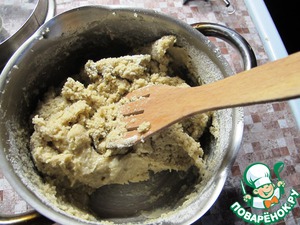 Убавить огонь и всыпать овсяную муку (молотые хлопья), постоянно помешивая. Когда загустеет, снять с огня и по одному вбивать яйца, хорошо перемешивая и взбивая.