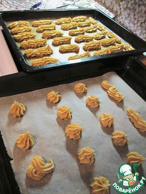 С помощью кондитерского мешочка отсадить одинаковые "колбаски" длиной около 8 см, 30-35 штук.