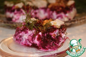 Выстелить сверху оставшуюся свеклу. Посыпать оставшимися орехами и укропом 1 ч. л. Поместить на 20 минут в холодильник. обернув кольцо снизу бумажным полотенцем, которое впитает в себя выделившийся из свеклы сок.