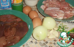 Соединить печёнку с фаршем, добавить все специи, очень хорошо перемешать, чтобы получилось однородная масса.