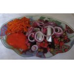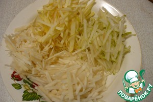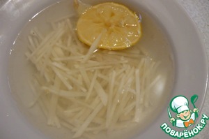 Налить в посуду воду. Выдавить туда сок половины лимона. Все резать тонкой соломкой по очереди. Опускать в воду на несколько минут, чтобы не потемнели. -