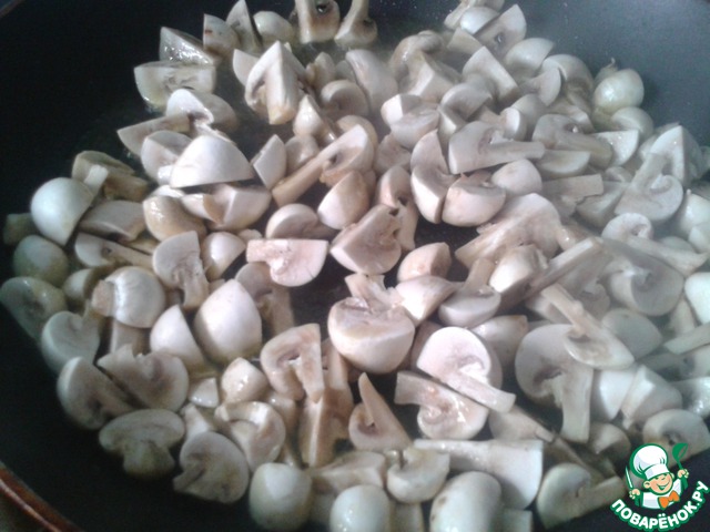 По истечении этого времени добавляем шампиньоны и вливаем 100 мл вина.