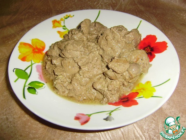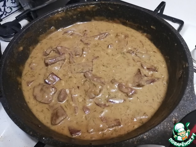 Теперь кладем к печени сметану, солим и перчим, перемешиваем. В ½ стакане холодной воды развести муку так, чтобы не было комочков, и ввести ее в печень. На маленьком огне, помешивая, дать соусу загустеть до нужной вам консистенции. Дать блюду настояться 10-15 минут и все, можно подавать на стол. Приятного аппетита вам и вашим близким!!!