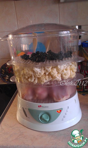 Для этого блюда нужна отварная курица, отварная цветная капуста и размягчённый чернослив.