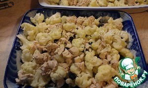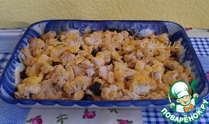 Отварную куриную грудку режем небольшими кусочками, соединяем с цветной капустой и порезанным черносливом. Перемешиваем и выкладываем в смазанную маслом жаропрочную форму.