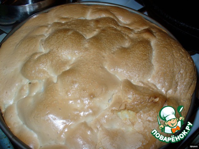 Белки с сахарной пудрой взбить в крутую пену. Выложить горкой на пирог и запекать в духовке, пока безе не зарумянится.