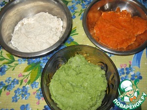 Куриное филе, морковь, брокколи измельчить в блендере в пюре, подливая сливки, посолить по вкусу. В овощи добавить по 2 стол. ложки сливок, в мясо - 4ст, л. (можно добавить больше, смотрите по консистенции).