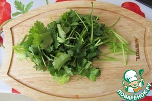 Кинзу моем, слегка обсушиваем и режем. Вкусно получается и со свежим базиликом.