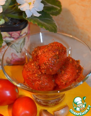 Острая закуска. Готовить легко и быстро. Получается вкусно. Необычный, очень приятный вкус и не маринованных, но уже и не совсем свежих помидоров. Попробуйте!