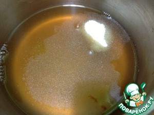 Через 40 мин. ставим на огонь бульон с желатином и постоянно помешиваем, нам надо хорошо прогреть желатин, но не кипятить его. В емкость, где будем делать заливное, налить на треть бульона и поставить остывать на подоконник до полного застывания