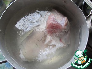 Свиную рульку весом 1,2-1,6 кг замочить в холодной воде часа на 3-4, один-два раза поменяв воду.