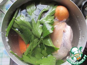 Уложить отмокшую рульку в кастрюлю, залить холодной водой так, чтобы она только слегка её прикрывала, добавить морковку, луковицу, стебли и зелень сельдерея. Поставить на огонь, довести до кипения, тщательно снять пену, добавить лавровый лист и душистый перец, убавить огонь до минимума и варить рульку 3-3,5 часа при самом слабом кипении. За час до окончания варки всыпать соль.