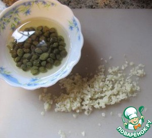 Чеснок очистить и мелко порубить, отложить 2-3 столовых ложки каперсов.