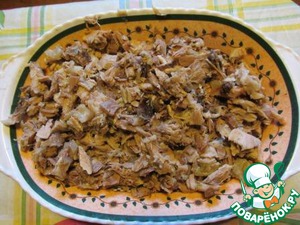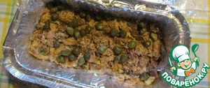На кожу в форму уложить половину подготовленного мяса. Легонько утрамбовать ложкой. Залить мясо в форме несколькими ложками желатинового бульона. Выложить равномерно каперсы.