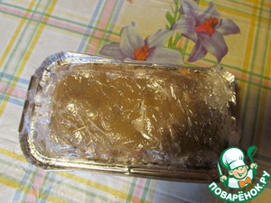 Подходящую форму смочить изнутри холодной водой, застелить пищевой пленкой так, чтобы края пленки свешивались по краям формы.