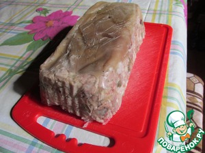 Выложить остальное мясо в форму, ещё раз слегка уплотнить, залить постепенно желатиновым бульоном. Почему постепенно? А потому, что бульон должен лишь слегка показаться на поверхности мяса. Некоторое количество желатинового бульона может остаться неиспользованным. Сверху выложить оставшуюся кожу. Прикрыть форму концами пленки. Убрать в холодильник на ночь, придавив сверху небольшим грузом. У меня это был литровый пакет молока.