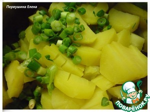 Отвариваем картофель в мундире. Режим его на кубики и кладем в чашку с предварительно порезанной зеленью.