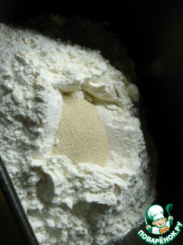 Я тесто заводила в хлебопечке, заложить все необходимые продукты по правилам, т. е. сначала жидкие, затем сухие продукты, дрожжи высыпаем сверху муки, сделав небольшое углубление.