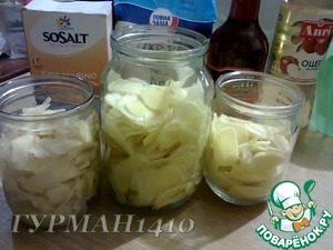 6. Имбирь раскладываем в банки. Красиво порезанный в одну банку, остальной – в другую (я сначала разложила красивый имбирь в две банки, думала, что литровой не хватит, потом вернула все обратно, хорошо все утрамбовав).