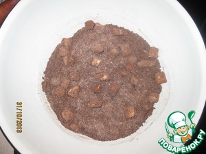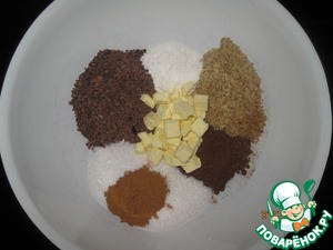 Первым делом готовим шоколадно-ореховую смесь. Для этого измельчаем орехи, шоколад трем на крупной терке или режем ножом, холодное сливочное масло нарезаем на мелкие кубики, добавляем корицу, сахар, какао и муку.
