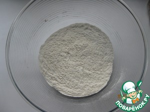 Приступаем к подготовке теста. Муку, соль и разрыхлитель просеиваем. Перемешиваем.