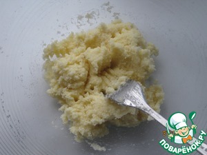 Соединяем сахар, ванильный сахар и размягченное сливочное масло (именно размягченное, а не растопленное). Разминаем вилкой до однородного состояния.