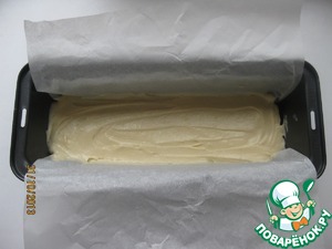 Форму для выпекания застилаем пергаментом (можно не застилать, а просто смазать сливочным маслом, но так легче доставать из формы). Выкладываем половину теста, разравниваем.