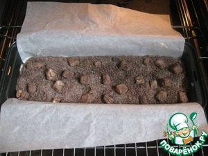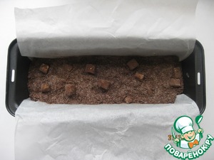 Сверху распределяем половину шоколадной смеси. Затем ещё слой теста и слой смеси.