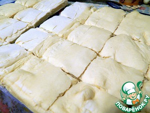 Первым делом поставим размораживаться тесто. А затем произвольно порежем его на прямоугольники со стороной примерно 5-6 см, в принципе тут все зависит от величины конфет, которые будут использованы в начинке.