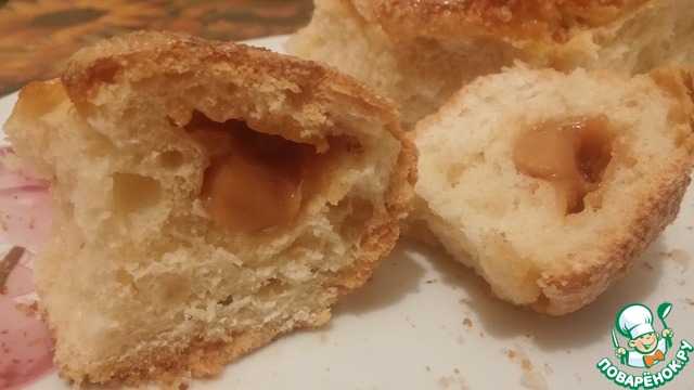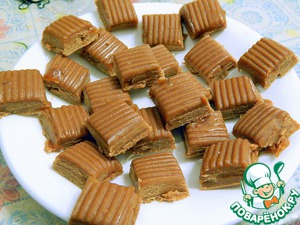 У меня в качестве начинки молочная карамель "Ирис". Она продается одним блоком, который я просто порезала на кусочки.