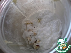 Оставшиеся крупные частицы складываем в отдельную мисочку –их мы будем использовать под конец, когда весь арахис будет перемолот. Ссыпаем их в чашку блендера, добавим сахарной пудру и смелем.