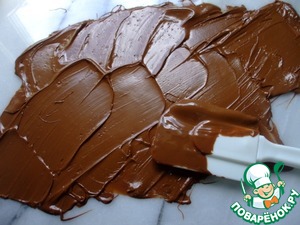2/3 шоколада вылить на холодную чистую поверхность (у меня мраморная доска) и размазывать по поверхности (я размазывала силиконовой лопаткой) пока шоколад не начнет густеть и казаться холодным при прикосновении к нему.