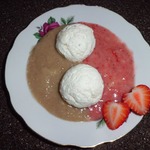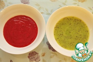 Для кули. Протрите через сито или измельчите блендером по отдельности плоды киви и клубнику. В каждый вид пюре по вкусу добавьте сахарную пудру.