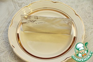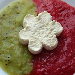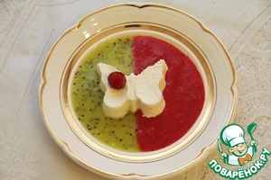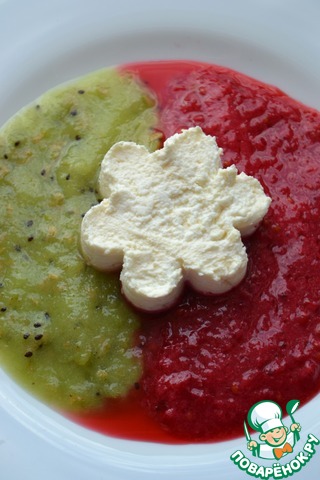 Возьмите лист картона, длина стороны которого равна диаметру дна тарелки. Оберните его фольгой. Поставьте картон на середину тарелки. На одну половину тарелки выложите 2 ст. л. пюре из киви и распределите по ней. Картон не поднимайте. То же самое сделайте со второй половиной тарелки, только с пюре из клубники. Осторожно уберите картон.