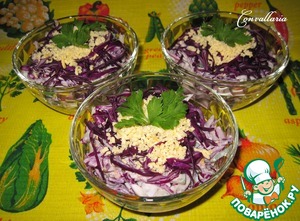 Оставить немного для украшения яичные желтки и краснокочанную капусту. -